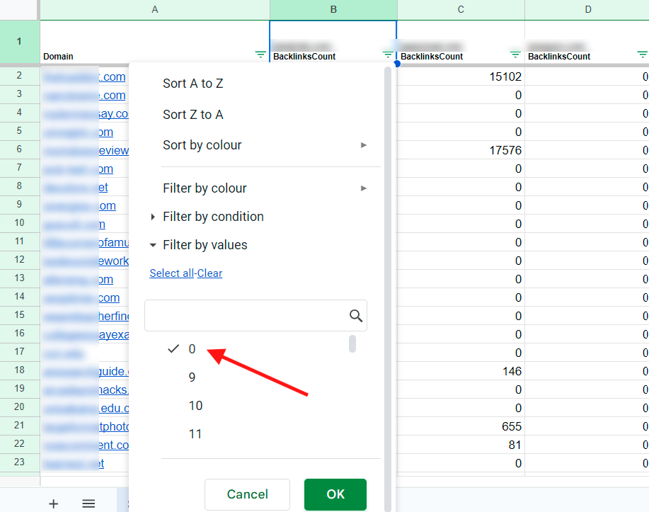 I export this report to Google Sheets and create a filter where the number of my donors is equal to 0, but the number of my competitors’ donors is greater than 0: