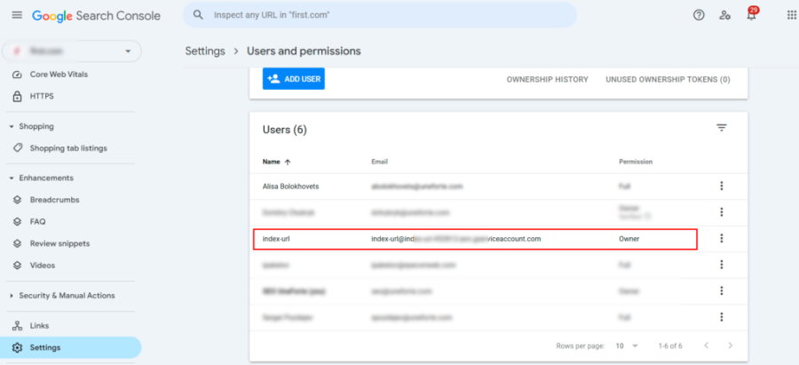 4. Click “Add user”, and enter the email address of the service account (you can find it in the JSON file, e.g., your-bot@your-project.iam.gserviceaccount.com).
