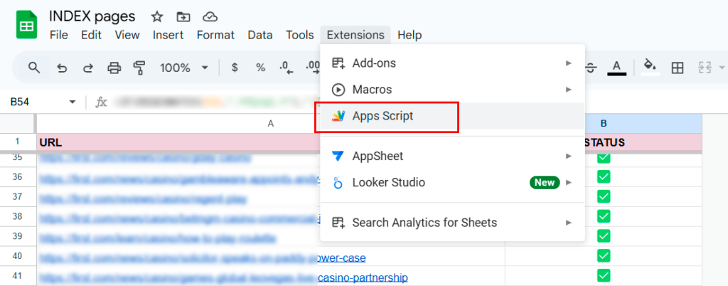 1. In your Google Sheet, click on “Extensions” → “Apps Script”.