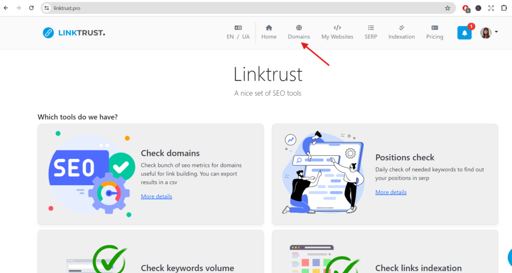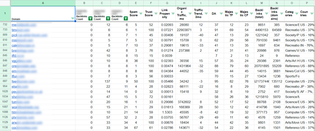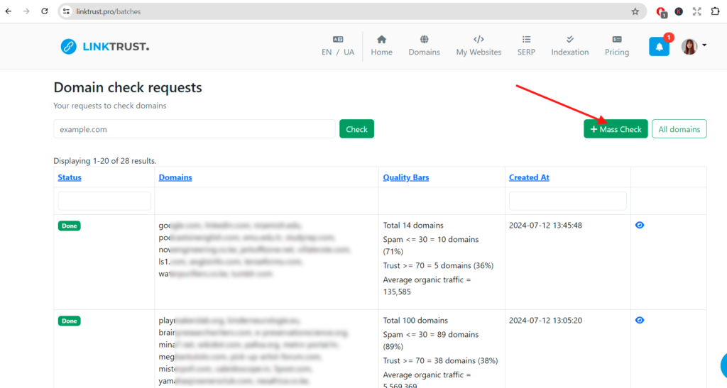 At this step, I have obtained a list of potential donors where I can publish my guest posts to promote my site. I export this list to the LinkTrust system and use the “Batches Analyze (Domains)” tool. I prefer this tool because it provides various characteristics, but you can also use other sites for parameter estimation, such as Ahrefs, Semrush, etc.